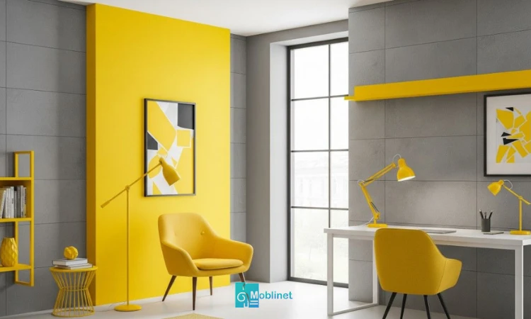 طوسی زمینهای خنثی و شیک فراهم میکند، در حالی که لکههای رنگی زرد (مثلاً در صندلی یا کوسن) جلوی کسالت را میگیرند و خلاقیت را تحریک میکنند.
