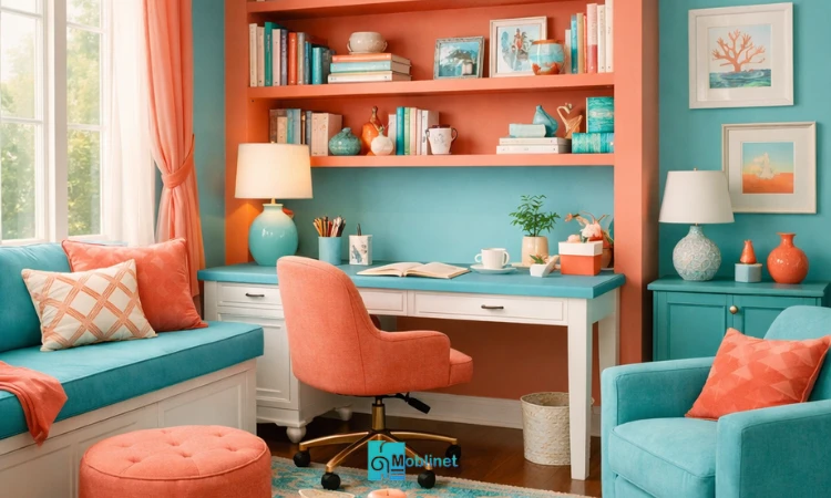 یک ترکیب جسورانه برای کارهای هنری. فیروزهای آرامش میدهد و مرجانی (Coral) انرژی و شور و شوق را بالا میبرد.